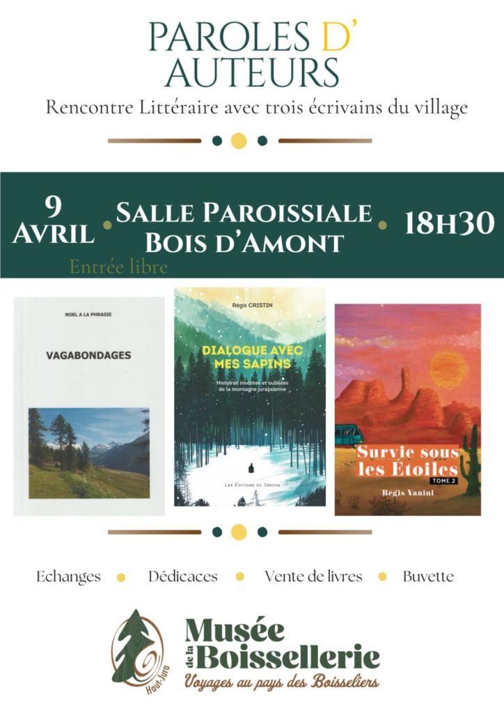 Le Musée de la Boissellerie organise une rencontre littéraire gratuite le jeudi 9 avril 2026 à 18h30, à la Salle Paroissiale de Bois d’Amont. Au programme : échanges avec les auteurs, dédicaces, vente de livres et buvette. Entrée libre, tout public.